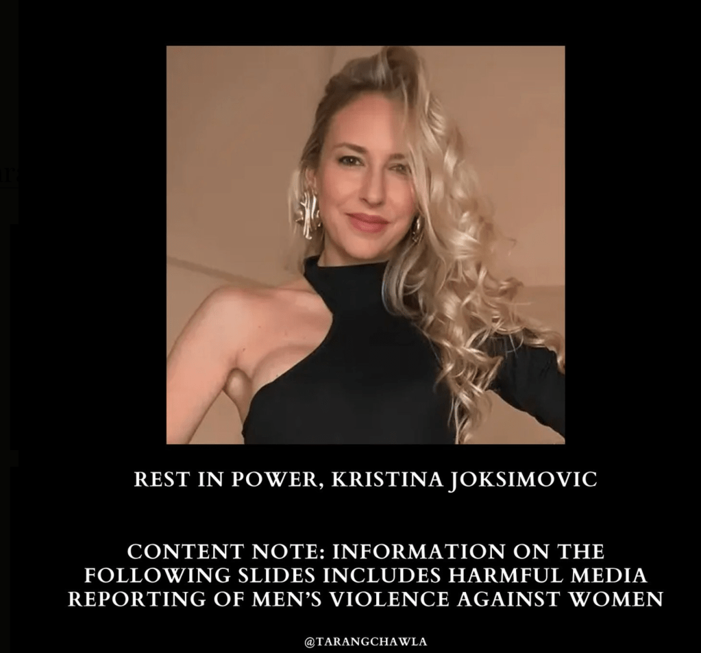 I won’t include the next slide in Tarang’s post, but the Australian media reporting of Kristina Joksimovic’s murder is deeply disturbing.
